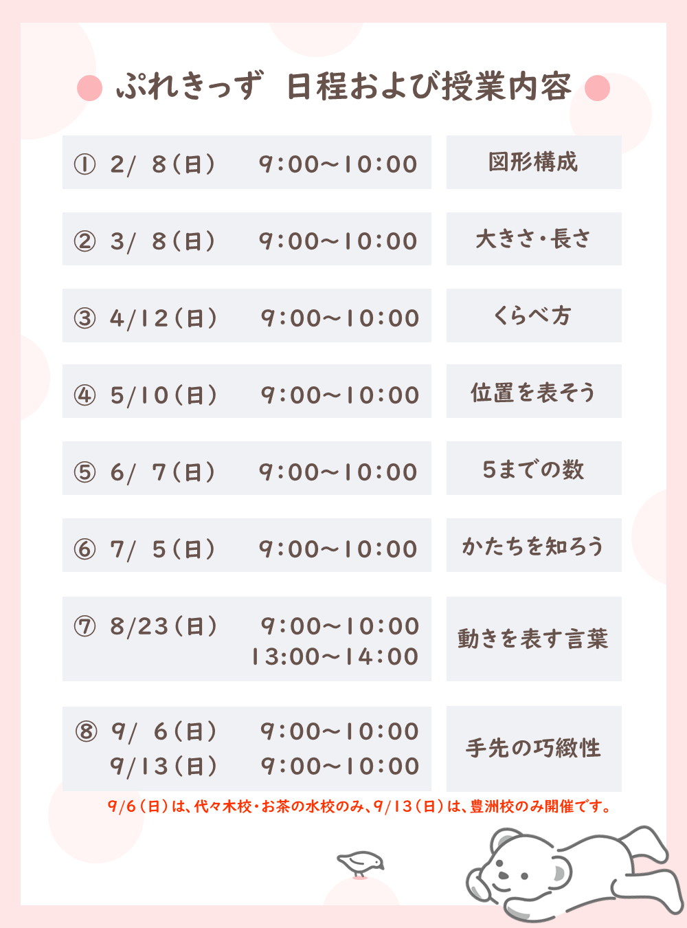 ぷれきっず第3回~第8回は、年中生のカリキュラム(平常授業:第1週~第6週分)を行います。